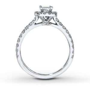 A princess-cut diamond takes center stage in this dramatic engagement ring for her.A supporting cast of round diamonds frames the center and lines the band of 14K white gold for a design worthy of applause. The ring has a total diamond weight of 7/8 carat.