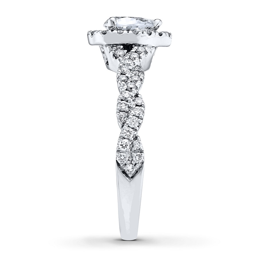 This glamorous engagement ring showcases a pear-shaped diamond, framed in round diamonds. Ribbons of round diamonds adorn the 14K white gold band for a total diamond weight of 3/4 carat.