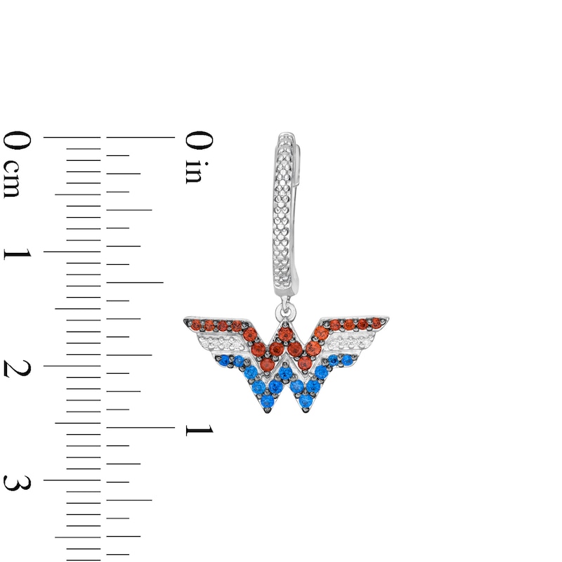 Bursting with action, these gemstone and diamond drop earrings bring eye-catching color to your fearless style. Crafted in sterling silver, each earring showcases the logo lined in regal red garnets, bright blue sapphires and sparkling diamonds. Diamonds adorn the hoop for an extra hint of shimmer. Captivating with 1/20 ct. t.w. of diamonds and a brilliant buffed luster, these earrings secure with hinged backs. This exclusive fine jewelry collection inspires you to wear your strength, confidence and power.